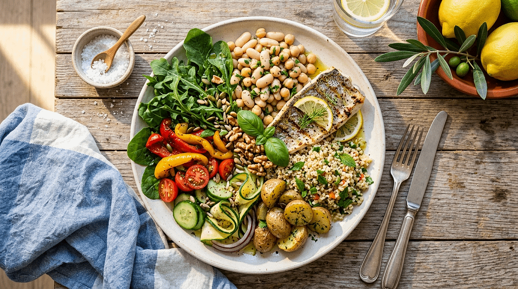 Du benötigst keinen perfekten Ernährungsplan, keine exotischen Pulver und keinen Kühlschrank voller Spezialprodukte. Oft beginnt der größte Hebel mit einfachen mediterranen Basics: mehr Gemüse, bessere Fettquellen, mehr Pflanzenstoffe, weniger stark verarbeitete Lebensmittel.